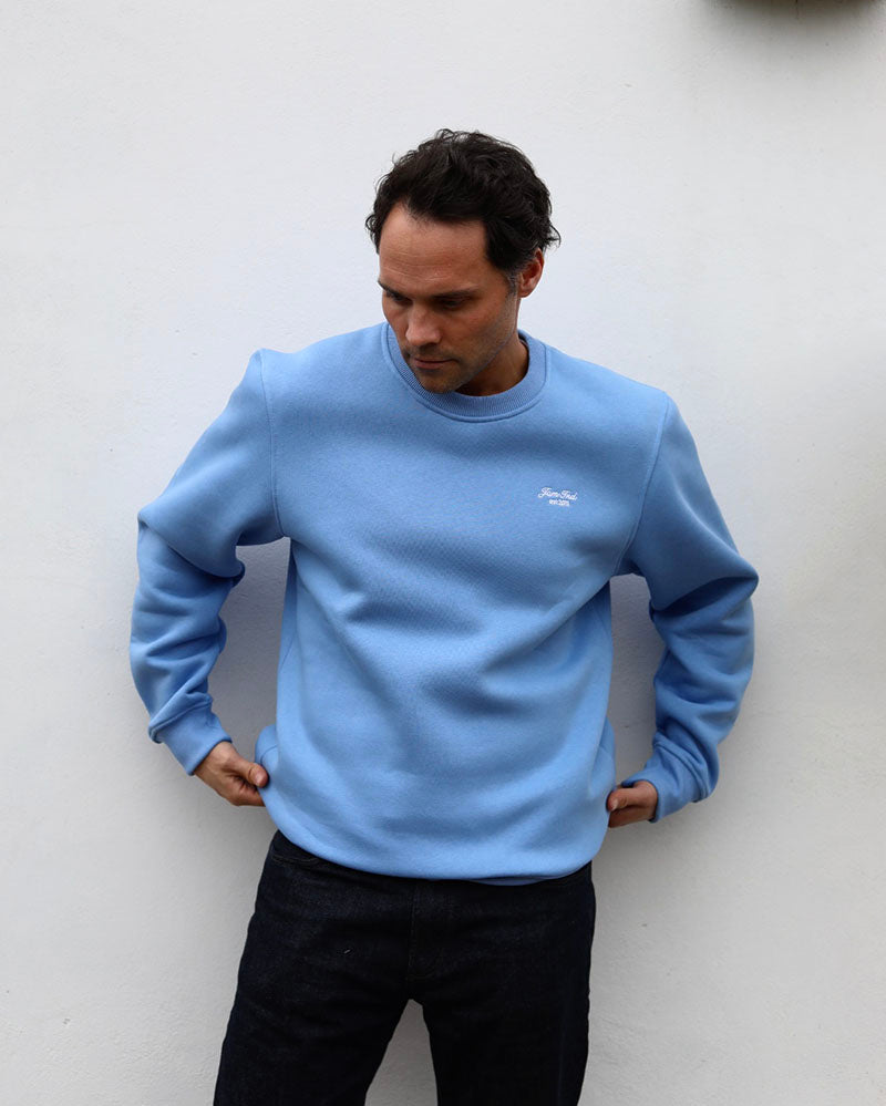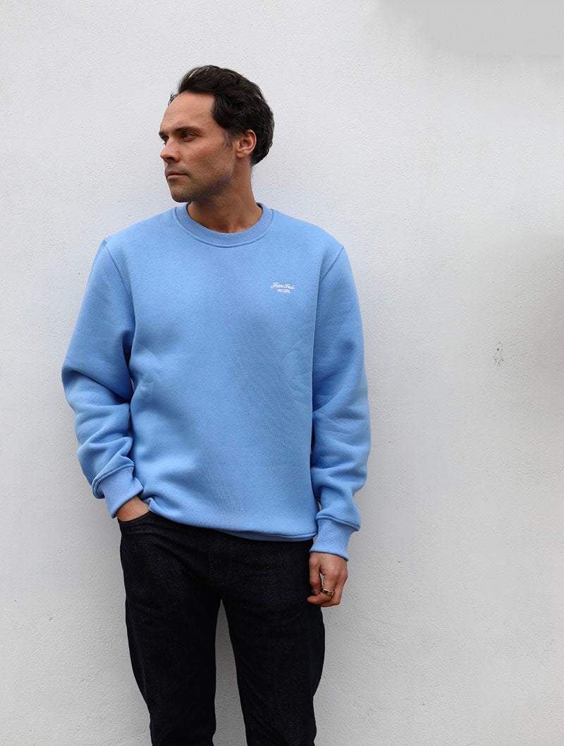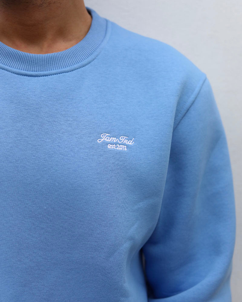 A timeless brushed cotton, summer blue crewneck sweatshirt featuring white embroidered Jam Ind text. Designed to be shared and made to be lived in.