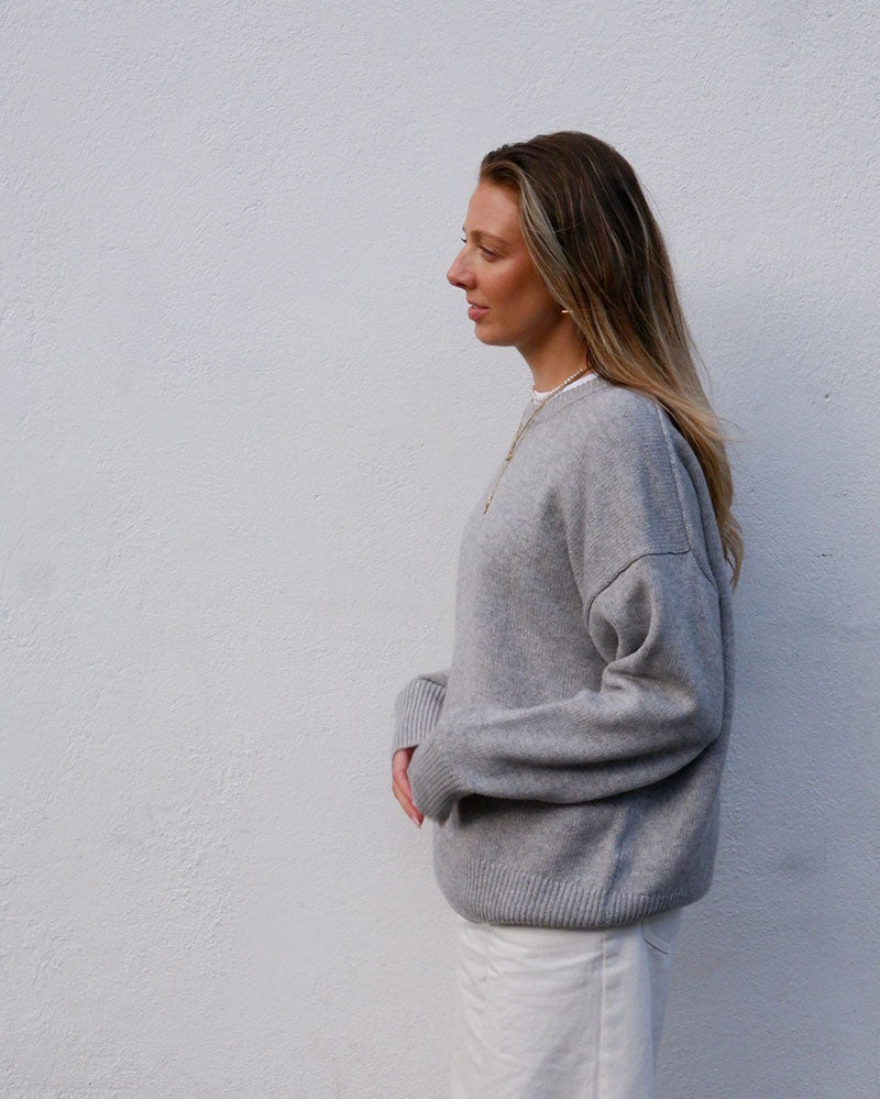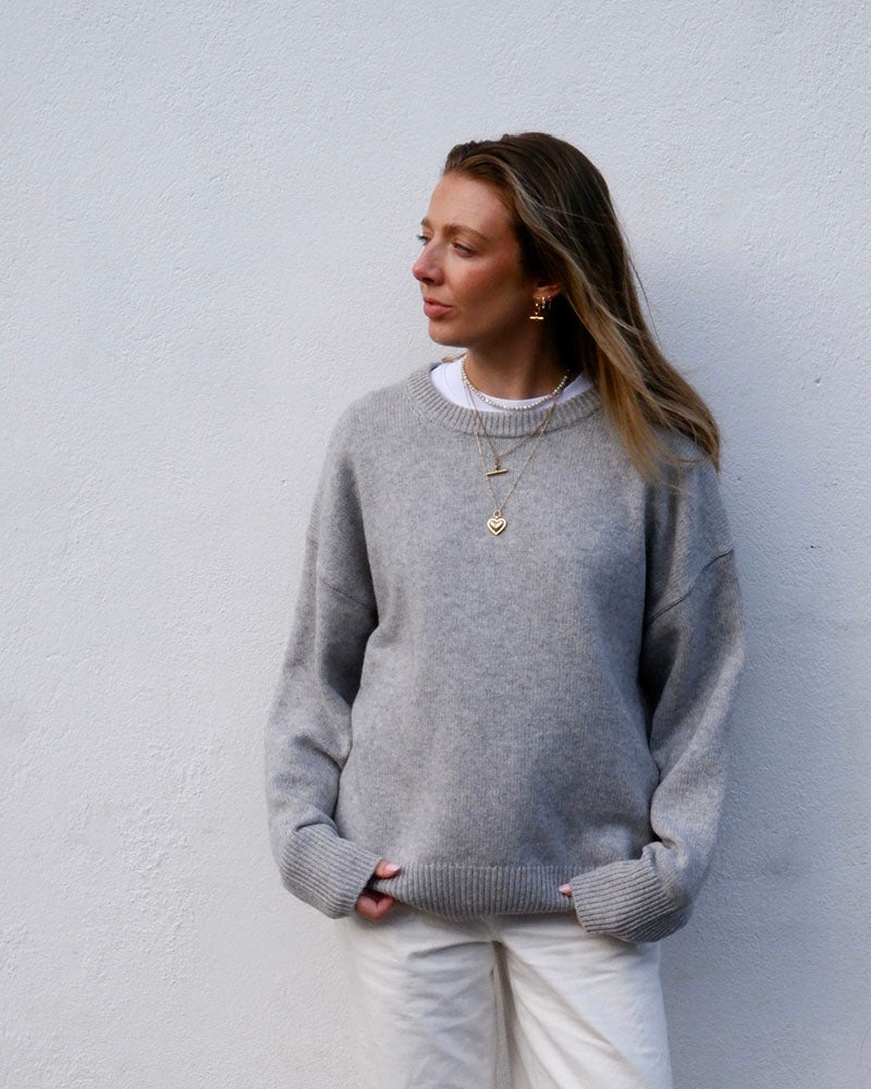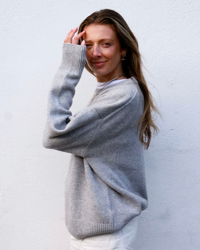 New for Spring 26 we are excited to re-introduce our best-selling, cashmere-merino wool crew neck jumper in silver grey. Designed to be shared by both him & her; a quiet luxury must have!