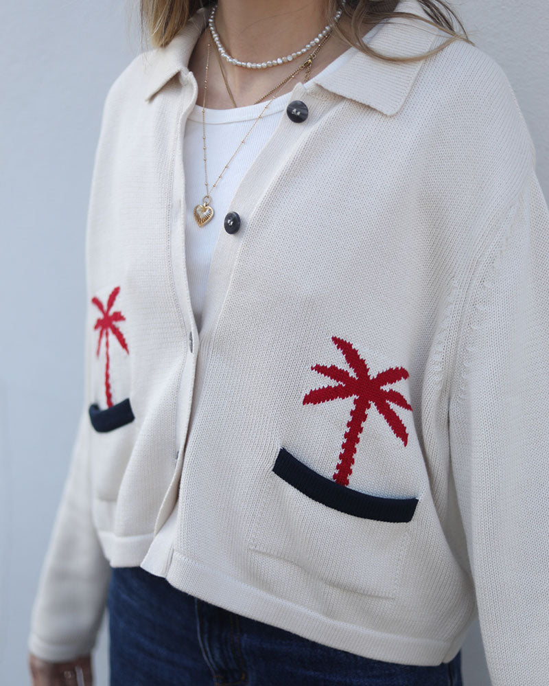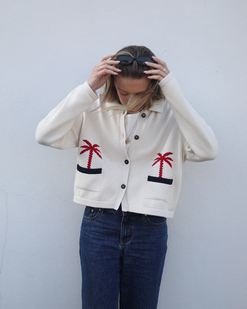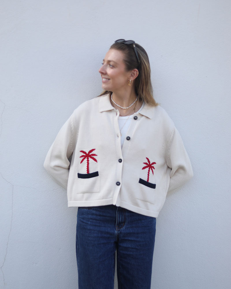 New For Spring Summer 26 We Are Excited to Release the Palma Cardigan. Inspired by the Mallorcan favourite city, Featuring Knitted Palms from left and right pockets. 100% Organic Cotton.