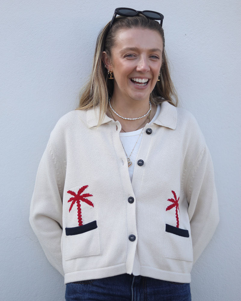 Theres something about palm trees that we associate with holidays, rest and fun all bundled into one, and it felt like time to drop some into our knitwear. This Cardi will do all the talking for you so we recommend pairing with a pair of Navy high waisted denims or our new Byron Trouser.